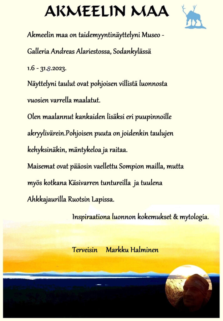 Aloitamme yhden huoneen näyttelytoiminnan Reidar Särestöniemen pysyväisnäyttelyyn, jotka tulevat vaihtumaan kerran vuodessa. Nyt avattu näyttely keskittyy Särestöniemen taiteen alkuvuosiin. Näyttely on nimetty Taivaanjaara öljyväri maalauksen mukaan. Reidar maalasi sen viimeisenä Repin instituuttivuotenaan Leningradissa. Teos, joka sytytti sammumattoman mielenkiinnon Reidarin taiteeseen.